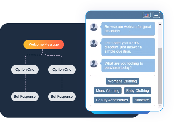 Design interactive customer journeys and chat flows from scratch with ease. Let users interact with your chat, answer questions, make decisions, click buttons and choose their responses. Fine tune and tailor your responses with custom keywords that trigger pertinent information.